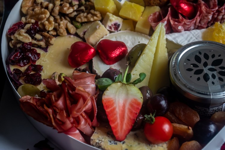 I was a bit disappointed to have only half of a strawberry with chocolates I could find in Sainsbury. I wish they added one or two strawberries dipped in melted chocolate. It would have been perfect. I didn’t understand the presence of falafels on the board. They were a little bit dry so I would have enjoyed them better with yoghurt based sauce. There was only one cherry tomato. I think it would be best to have 3-5 of each item when the platter is for up to 5 eaters. The rose petals were added by me but it would have been great to have a couple of fresh roses in the box. There was enough space for them. You can see a little bottle of rosĂ© but it’s mine. This isn’t included.