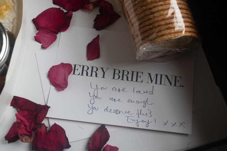I ordered a small box for 3 to 5 persons. The cheese board included: walnuts, pistachios, dried apricots, 4 different cheese (stilton, organic cheddar, goat cheese, brie, parmesan, mature cheddar), smoked ham, small falafels, caramelised onion & fig chutney from The Bay Tree, couple of chocolates, dried cranberries, cherry tomatoes, strawberry. I could add a personal message to the box. My card said: You are loved, you are enough, you deserve it! Enjoy.