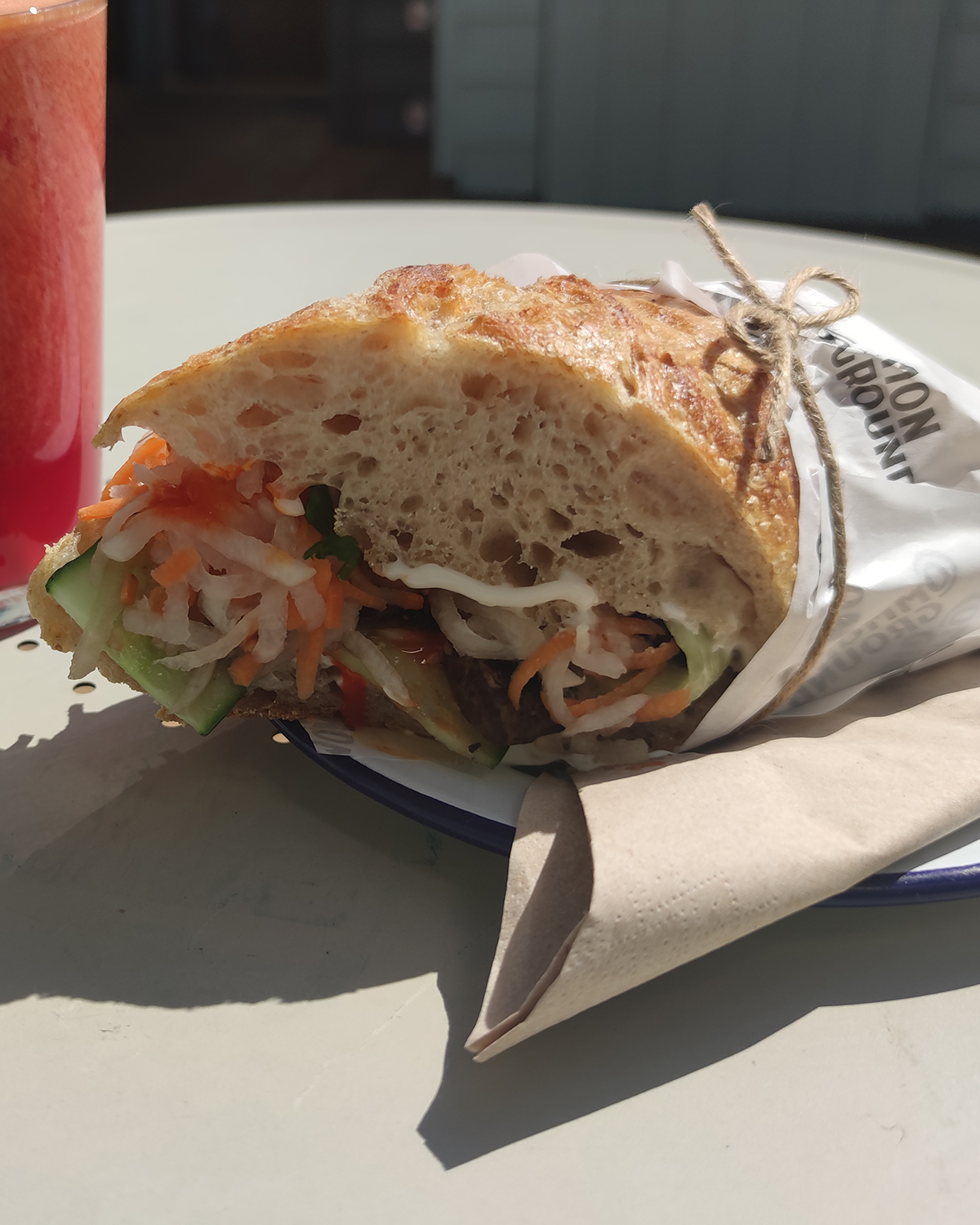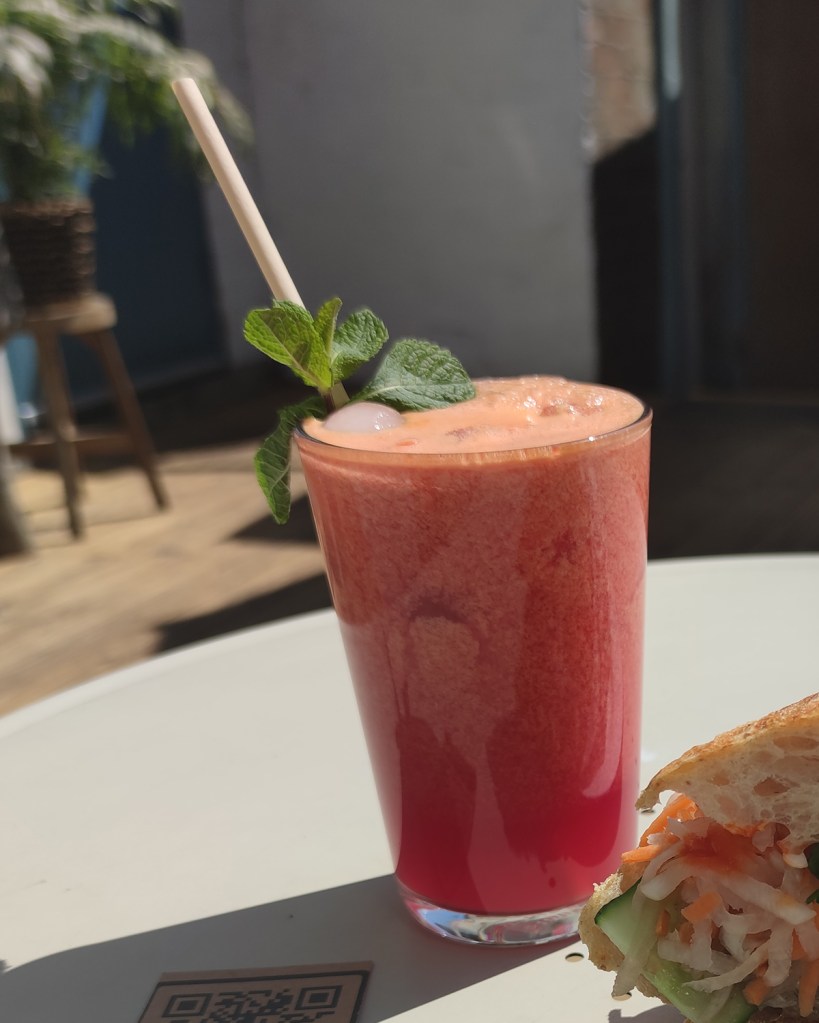 J’ai été attiré par les sandwich Bahn Mi dans la vitrine. C’est que j’ai commandé avec un jus de fruit frais à l’orange sanguine. Originaire des rues de Saigon, le sandwich Banh Mi est un hybride franco-vietnamien composé d’une baguette aérée, de daikon et de carotte marinés aigres, de coriandre croustillante, de piments épicés et d’un morceau de concombre frais entourant un certain nombre d’options de protéines, du sucré. du porc haché au pâté gras aux sardines. Celui que j’ai mangé était végétarien avec des champignons marinées. La garniture était délicieuse et savoureuse. Le pain était croustillant à l’extérieur et moelleux à l’intérieur. C’était pas vraiment une baguette selon moi parce qu’il y avait beaucoup de mie. C’était un peu bourratif. Je m’en suis mis un peu partout en le mélangeant je ne peux pas le conseiller si vous allez en date. Le jus était excellent et ça se voyait qu’il était aussi fait maison. Les sandwichs « Sabich baguette; ‘Ve’ Banh Mi; la foccacia Burrata et ail sauvage ne sont disponible que le weekend. Plus d’information sur le menu ici
