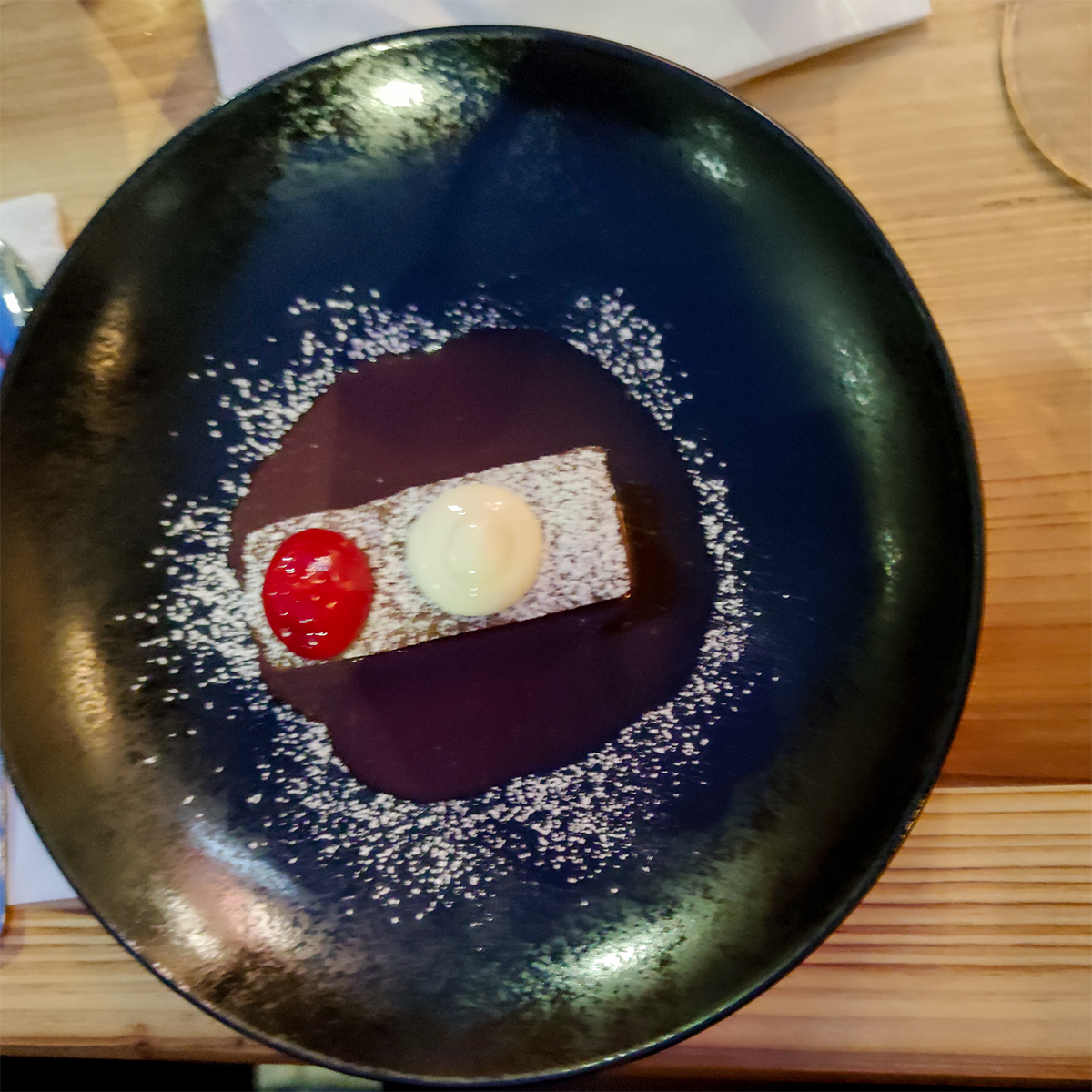 Les copines ont décidé de prendre des desserts qui avait l’air délicieux.: gâteau à la rhubarbe et moelleux au chocolat.