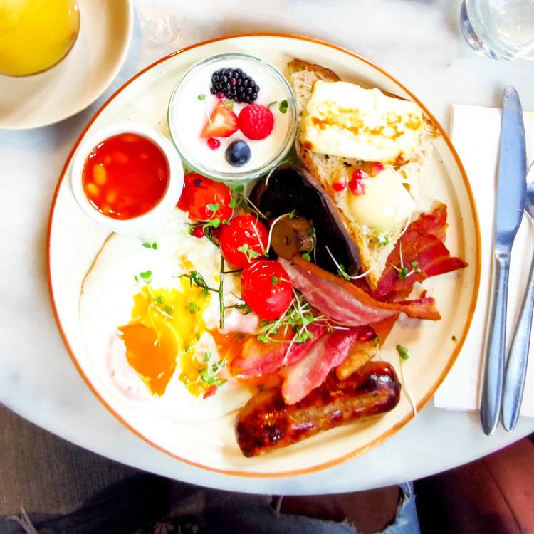 J’ai opté pour un Full English Breakfast. L’assiette inclut: deux oeufs au plat, du bacon, une saucisse, des tomates cerise, des champignons, de l’halloumi, un toast, du yaourt avec des fruits rouges. On reste sur un brunch classique britannique dans l’ensemble. Les influences méditerranéennes se retrouve dans l’halloumi et le yaourt.