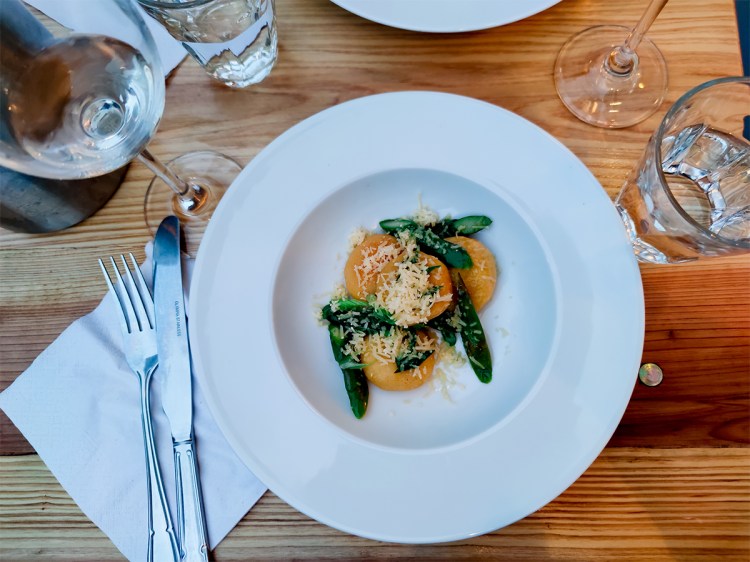 SkĂ„l means « Health » in Swedish. That evening I was not very hungry so I opted for a starter and a side dish. I discovered the Kroppkakor of Swedish dumplings. It reminds of gnocchi. It was very good but it tasted like not enough. They were accompanied by cheese and asparagus. I would have liked them to be filled as in the traditional recipe.