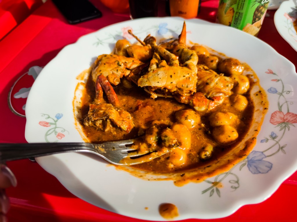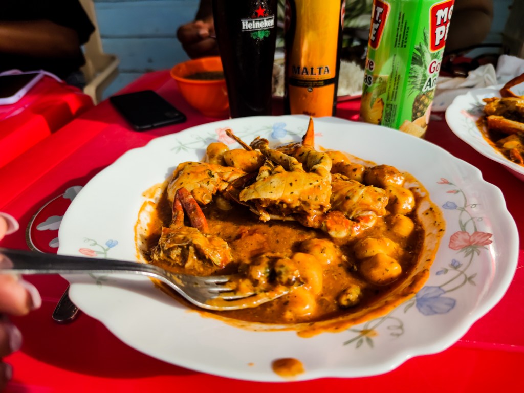Nous sommes allées déjeuner chez Maxoun un restaurant sur le front de mer. Quand j’ai vu « Dombrés-Crustacés sur la carte, je n’ai pas hésité une seule seconde. Ce plat me faisait envie depuis si longtemps. Je n’ai jamais eu la motivation de le faire moi-même. Les dombrés-crustacés est un plat mijoté qui inclut le plus souvent des crevettes et/ou du crabe et des boules ou galettes de pates qui peuvent rappelés les gnocchis. Il existe une autre version de ce plat sans fruits de mer mais avec des haricots rouges. J’ai lu que le plat à la base guadeloupéen avaient des origines juives. Des juifs hollandais fuyant le Brésil durant l’inquisition menée par les colons portugais au 17éme siécles ont créé les dombrés en recréant le knèfes. En faisant mes recherches, je suis tombée sur une autre version de knèfes… Des kneffes vosgiennes et des knepfles alsaciens! Je demande s’il y a un lien. Ce plat est à l’image des cultures créoles métisse et résilient. Je reviens à mon assiette 😋😋😋. En plus des dombrés, il y avait du crabe, des crevettes, des moules, du lambi… le bonheur pour moi.