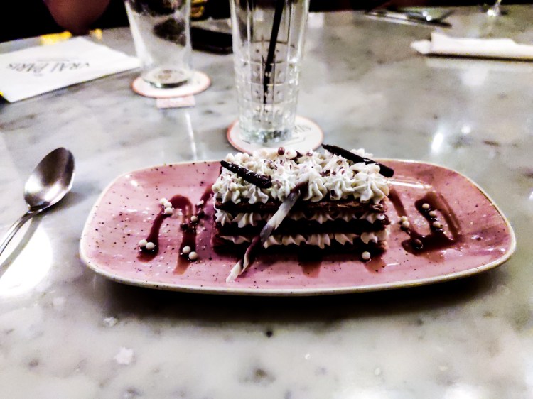 En dessert, j’ai pris un mille feuille. Je préfère le mille-feuille traditionnel à celui-ci. J’ai trouvé la pâte feuilletée un peu trop cuite. La crème patissière traditionnelle a été remplacée par une crème vanillée plus légère. Perso, j’adore et préfère la crème patissière. J’ai pas vraiment senti la vanille. Le pain de perdu de C. avait l’air délicieux.