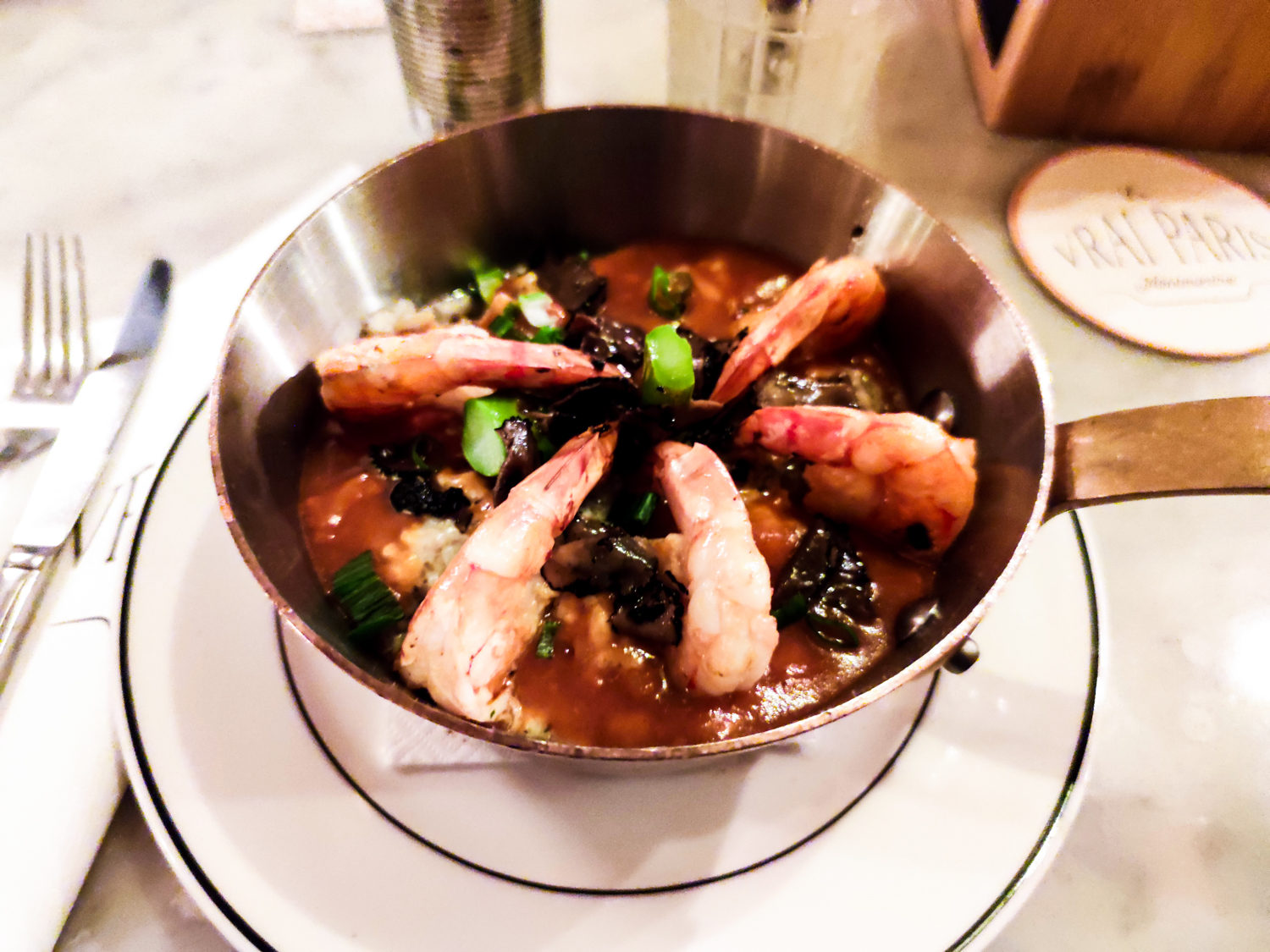 Hello! Comment vas-tu aujourd’hui? Aujourd’hui, je t’emmène diner au restaurant Le Vrai Paris. Ma venue de ce restaurant n’était pas planifié mais je spoile en te disant que ce fut une belle surprise. Ce soir là, j’avais rendez-vous dans un bar restaurant avec C. pour fêter son anniversaire. Elle l’avait choisi en se basant sur le menu diffusé sur gGoogle mais il s’avère qu’aucun des plats qu’elle avait virtuellement était soit en stock soit dans le menu estival. J’oublie de préciser que C. est enceinte donc elle a des restrictions niveau alimentation. Il y avait juste deux entrées qu’elle aurait pu manger… Je rappelle que c’était pour son anniversaire donc bon. On a fini nos boissons vite fait pour aller dans un autre restaurant pas loin et dont le menu était prometteur. Arrivé sur place, on se rend compte que la carte en ligne n’est pas la bonne. Les plats principaux sont à base de poisson. Les deux tiers des participants à ce diner voulait manger de la viande 😅. Le restaurateur a été super cool quand on lui a expliqué qu’on allait partir et nous a même fait des suggestions pour un bon restaurant de viande. En route pour le restaurant de viande, nous trouvons Le vrai Paris dont la devanture vole la vedette à tous les commerces de la rue.