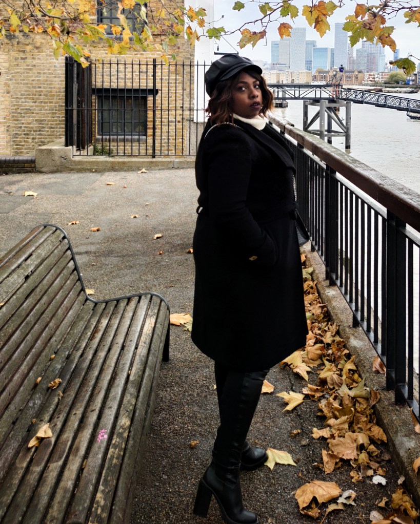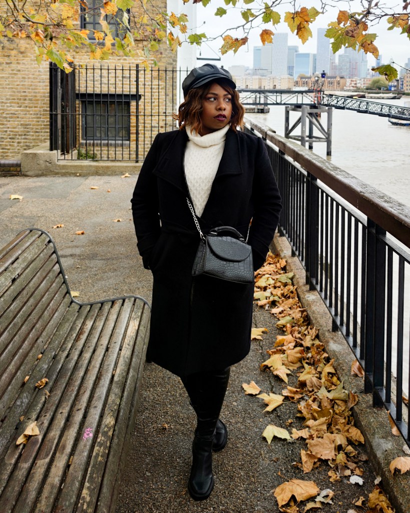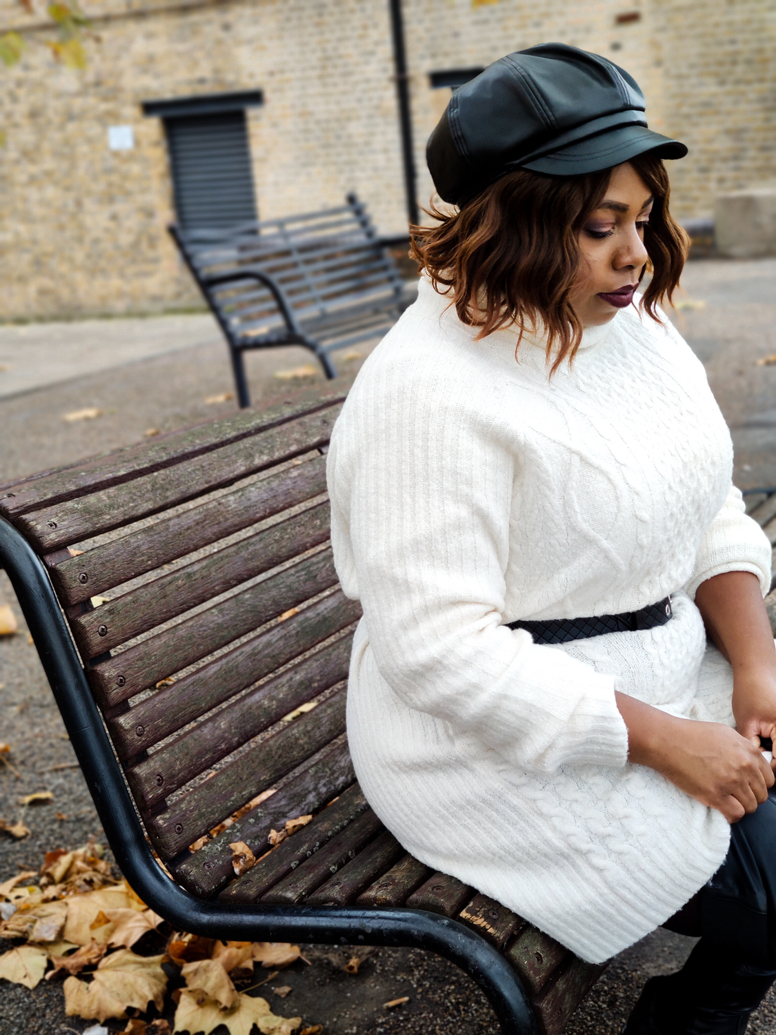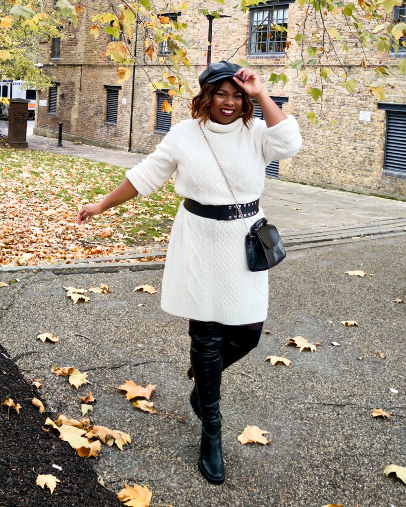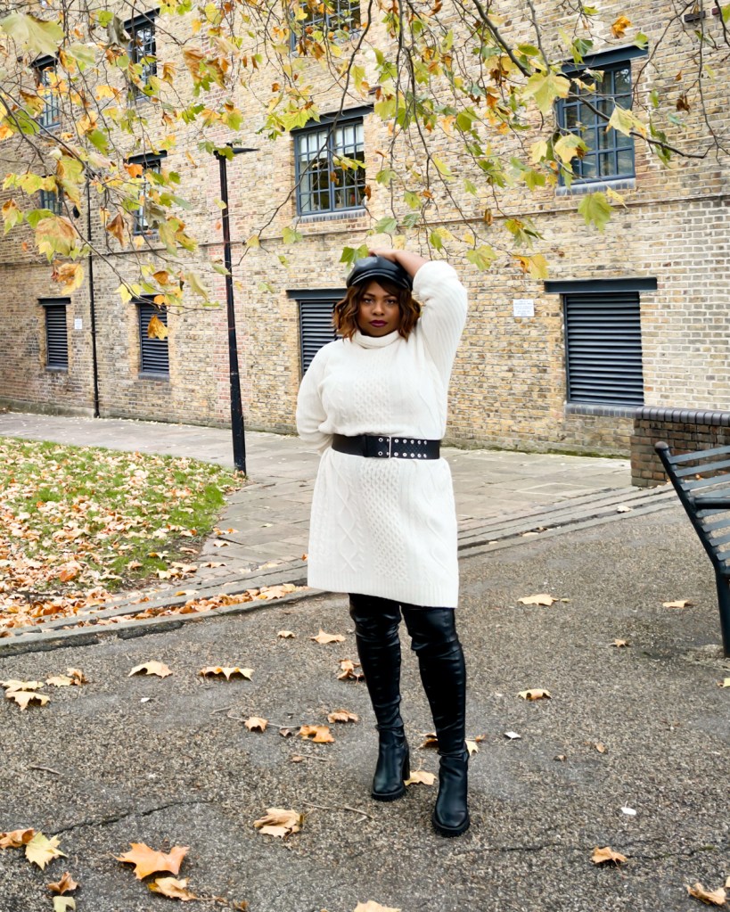 Reproduire le look: Robe pull – Primark (old), Cuissardes – Asos (old), Ceinture – Asos, Sac Ă main (old) – AliExpress, BĂ©ret – Asos (old), Manteau – Mango Outlet (old)