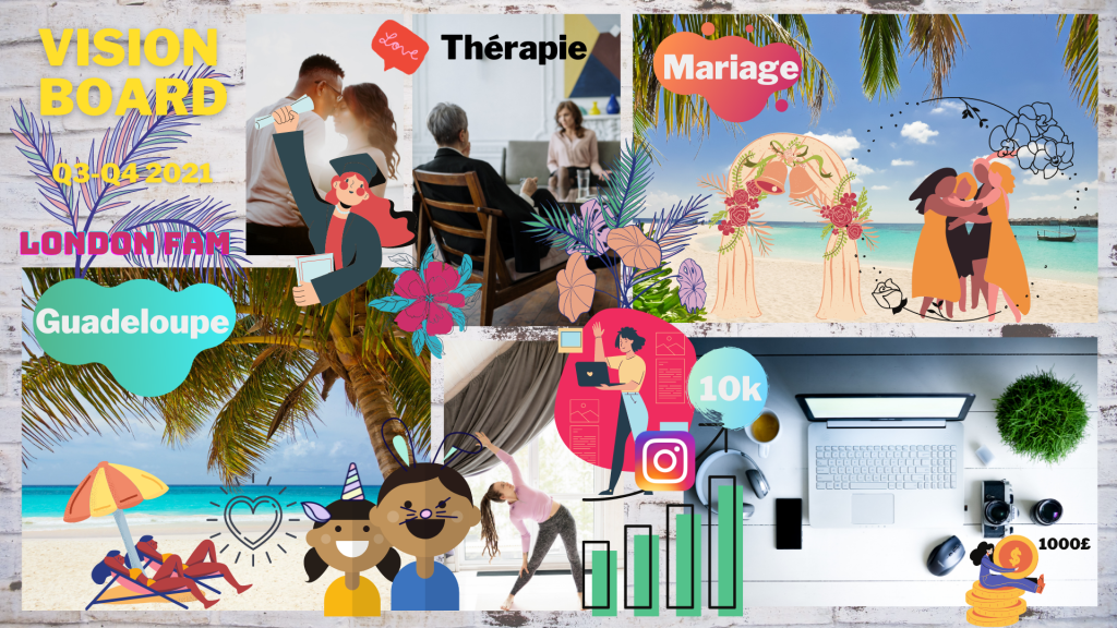 Je n’ai pas rĂ©ussi Ă tout faire. Mais j’ai de beaux exploits. J’ai trouvĂ© un nouvel appartement. J’ai rĂ©ussi Ă aller en Martinique et en Guadeloupe cet Ă©tĂ©. J’ai passĂ© deux mois chez parents! Tout ça Ă©tait loin d’ĂȘtre gagnĂ©!… il y a quelques contre temps comme le variant Omicron qui a fini par m’attraper! Je l’ai attrapĂ© juste comme il le faut pour devoir annuler mon voyage en France. Je devais y aller pour NoĂ«l. Je n’ai jamais manquĂ© un NoĂ«l avec mes parents. C’est une situation vraiment bizarre. J’ai quand mĂȘme passĂ© un bon NoĂ«l avec des amis Ă Londres. Nous avons bien mangĂ© et rigolĂ©. Je suis reposĂ© chez moi. J’en avais besoin. Je me sentais fatiguĂ© depuis des semaines. Mon congĂ© maladie Ă©tait aussi une semaine de repos. Les imprĂ©vus sont parfois des opportunitĂ©s pour vivre de nouvelles expĂ©riences. J’ai suivi pas mal de tutos sur Youtube mais voilĂ ce que moi j’ai fait pour crĂ©er un mood board. J’ai pris le temps de rĂ©flĂ©chir Ă mes envies, mes ambitions, mes rĂȘves surtout les plus fous! Je les rĂ©partie dans ces catĂ©gories: projets pros, projets persos, bien-ĂȘtre et finances. Parfois, j’inclus des projets de long terms qui ne pourront pas ĂȘtre rĂ©alisĂ© dans l’annĂ©e mais que je veux garder en tĂȘte. Puis, je cherche des images sur Pinterest ou Google images qui les reprĂ©sentent. Ensuite, je crĂ©e un document sur Canva et je rĂ©partis toutes les images. J’ajoute aussi des illustrations disponibles sur Canva pour reprĂ©senter mes objectifs. S’il y a trop d’ambitions, je rĂ©partis tout sur diffĂ©rents boards (un board par semestre ou trimestre). J’en trouve je rajoute des citations motivantes. Enfin, je garde une copie dans mon tĂ©lĂ©phone et dans les dossiers de mon ordinateur. L’objectif Ă©tant que je le regarde rĂ©guliĂ©rement. Ne pas perdre de vue son vision board c’est ne pas perdre de vue ses objectifs.